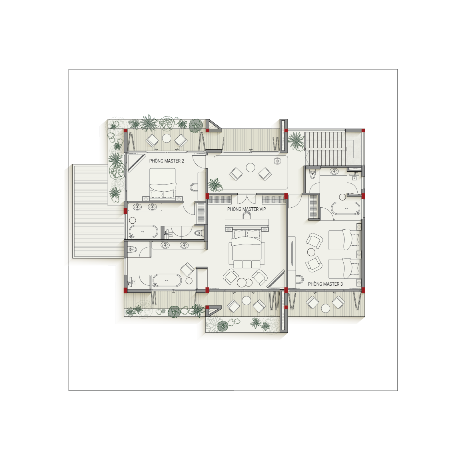 • The second floor is a serene retreat, offering three generously sized bedrooms, each with a private ensuite. From the balcony, you can enjoy breathtaking sunrises over Bình Tiên Beach, one of the most beautiful in the region. The second floor also features a communal living area, ideal for spending quality time with loved ones while taking in the inspiring natural beauty.